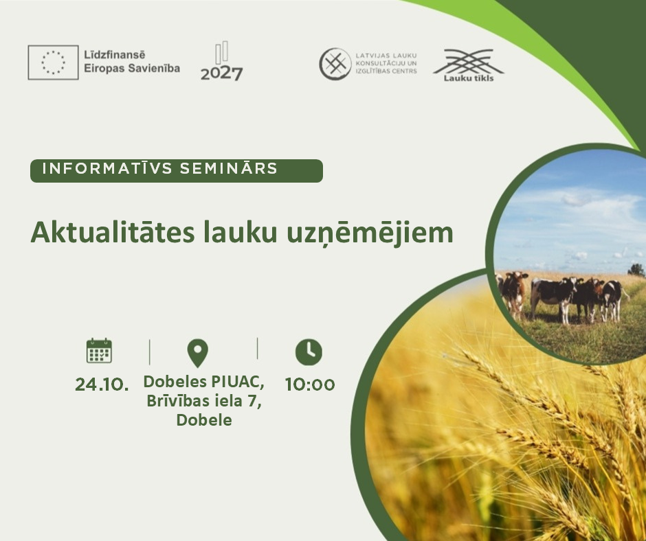 24. oktobrī LLKC Dobeles konsultāciju birojs rīko informatīvu semināru par aktualitātēm lauku uzņēmējiem.