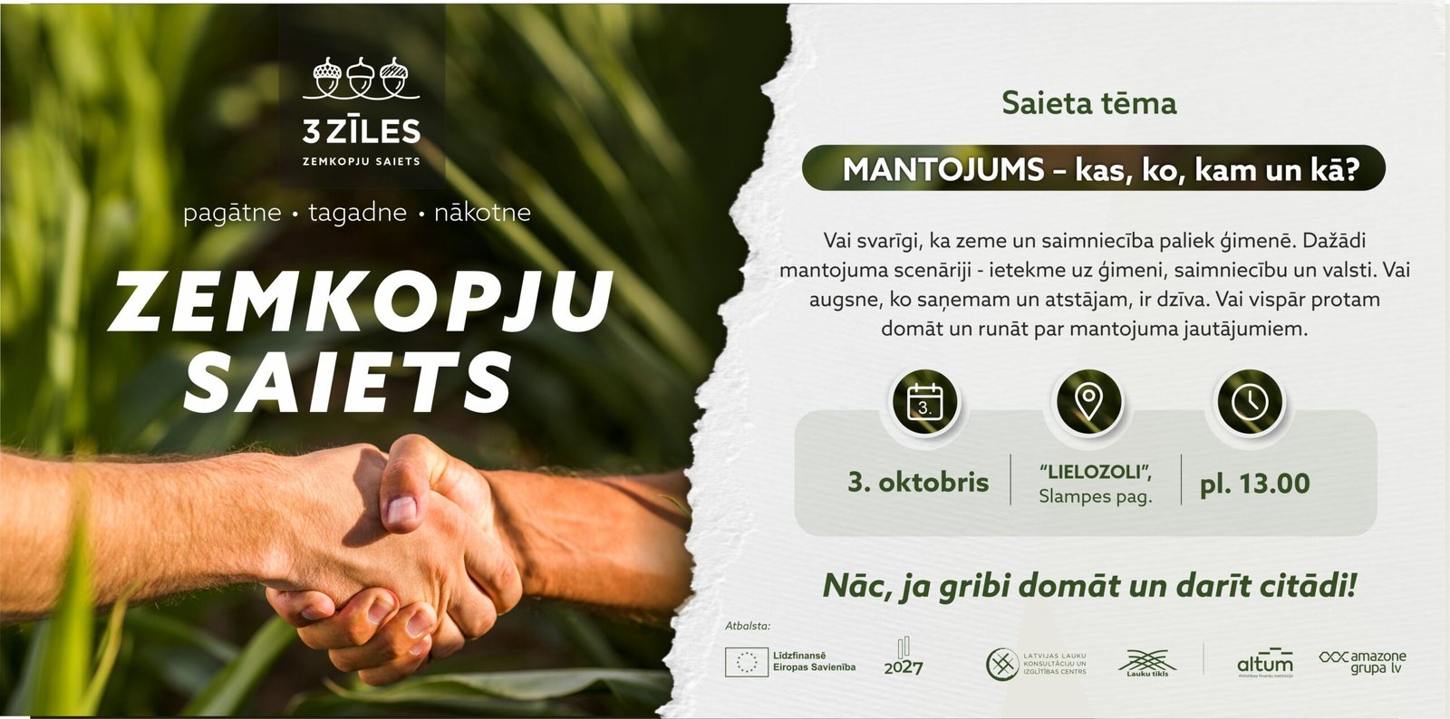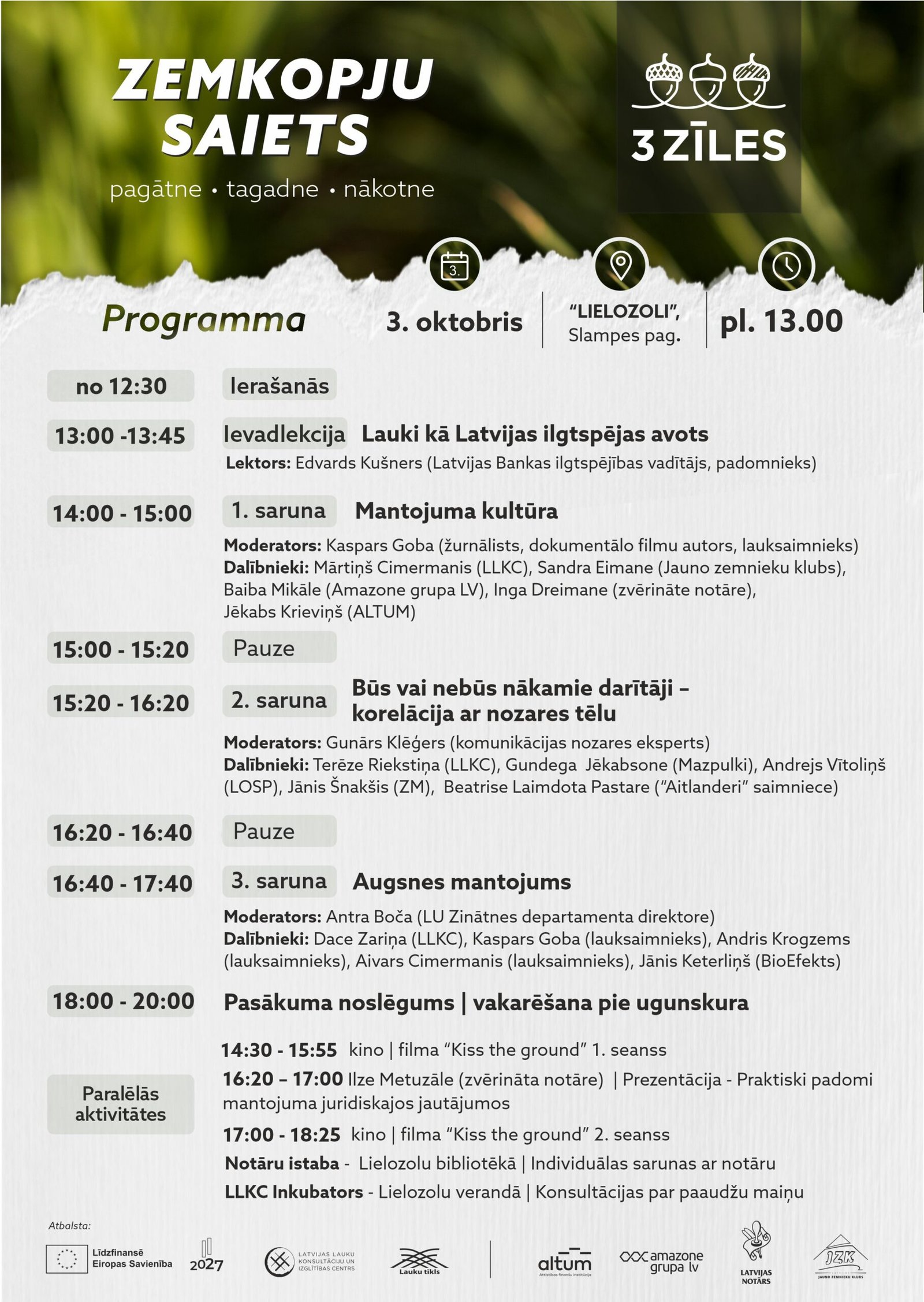 Zemkopju saiets “3 zīles” pirmo reizi pulcēs dalībniekus 2025. gada 3. oktobrī Slampes pagastā LLKC Mācību un demonstrējumu centrā “Lielozoli”. Tas būs pasākums tiem, kuri vēlas domāt un darīt citādi – vieta dzīviem, jēgpilniem dialogiem un kopradīšanai.